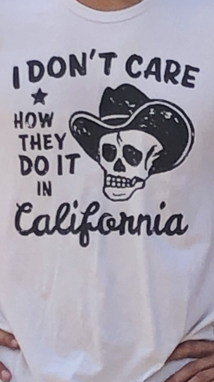 I dont care how they do it in California tee 15 40 Size This item is sold Like and save for later I dont care how they do it in California tee made by Big D. Lightweight Classic fit Double-needle sleeve and bottom hem. Only 43 believe were headed on the right path.